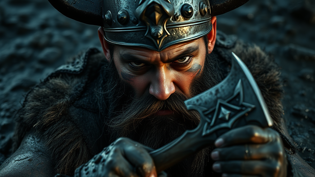 A close-up of a Viking King rising from slick, dark mud, wearing a shadowy metal helmet adorned with imposing black horns. His face is marked with intense dark warpaint and a weathered scruffy black beard, barely concealing a deep scar that sketches his fierce expression. Clutched in his powerful grip is an ornate Viking axe, its edges glistening under the cinematic lighting that casts dramatic volumetric rays, highlighting the moody atmosphere and the mud dripping from every surface.