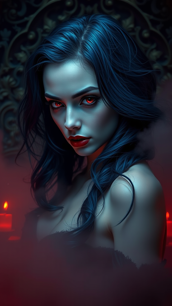 Ethereal porcelain-skinned vampiress with flowing midnight blue hair and piercing crimson eyes, exuding an irresistible charm; a bewitching queen of the night, embodying dark elegance in her hauntingly captivating allure. Set against an ornate, gothic backdrop, her presence is enveloped in thick, atmospheric mist, enhancing the dramatic, eerie ambiance. Her skin glistens with a dewy sheen as she emerges from the shadows, embodying the essence of a femme fatale with her passionate poise. Crafted with incredibly realistic detail, the scene captures the full regal majesty of her being, illuminated by moody, volumetric lighting that highlights every intricate aspect, in a breathtakingly detailed, epic and photorealistic octane render.