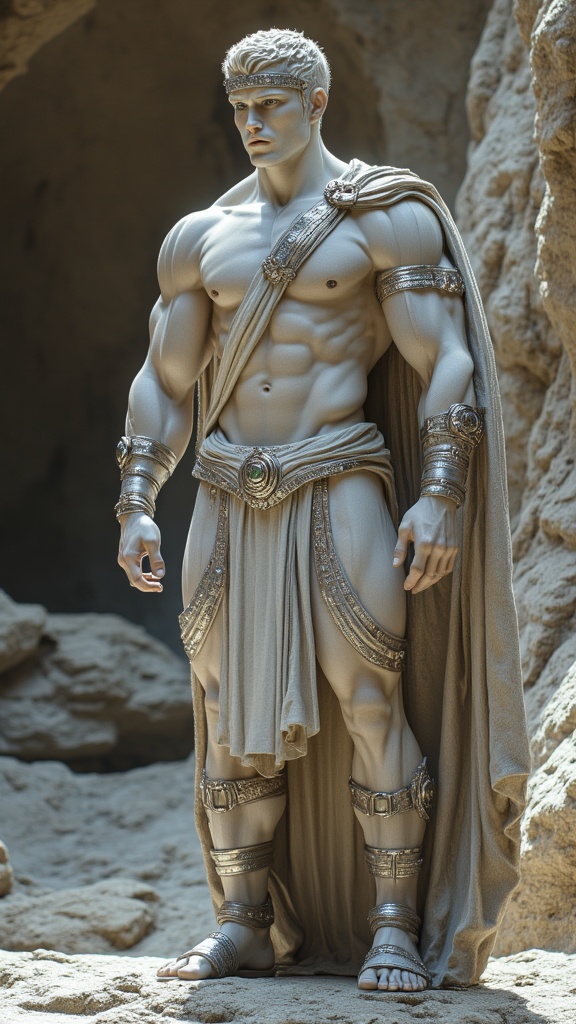 Sci-Fi futuristic fantasy, legend, homo-erotica. On another world, handsome giants known as Brutons emerged from the rock formations. They look like living statues or Greek gods with their marble-like skin and gemstone colored eyes. Ruggedly handsome, masculine, beautiful men with strong brows and sculpted jaws. Their faces are serene and peaceful. They stand at 7feet tall or taller, and their bodies are physical perfection with broad chests and backs, narrow waists, muscular sinewy bodies, strong massive arms, powerful legs. Their bodies are sculpted to perfection by nature, and they wear very little clothing; iridescent diaphanous white thongs on their girthy genitals and metallic sandals with straps up to the calves. There may be metallic bands around the tops of their biceps, and metallic bracers on their arms. They all wear metallic circlets around their foreheads, their hair is short and sculpted, usually a wavy fade hairstyle of any color. They help build the futuristic city as well as guard it, carrying huge shining swords or fighting with their own massive muscles. When they are not standing at attention, they keep company with each other, laying together and absorbing sunlight. They do not sweat, but their bodies glisten and sparkle from the microcrystals inside their bodies. They do not speak, but share a telepathic bond with one another. They are an all-male race, looking only to each other for pleasure when not building or gaurding. The other beings on their planet appreciate and love them very much for all they do. {{{MASTERPIECE}}}