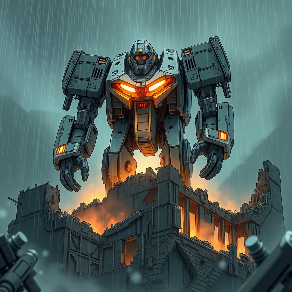 A colossal robot perched on the ruins of a building, its eyes glowing with an eerie light, reminiscent of Bionicle and mecha designs. The scene is infused with cyberpunk elements, as rain pours down and smoke billows around the structure. Rendered in an ultra-detailed, complex 3D style at 8k resolution, this striking image captures the essence of high-quality CG suitable for wallpaper. The artwork features a rich depth of field and bokeh effects, blending cartoon and anime influences with finely detailed sketches. This extraordinary visual is crafted with exceptional attention to quality and detail, offering a captivating glimpse into a futuristic world.