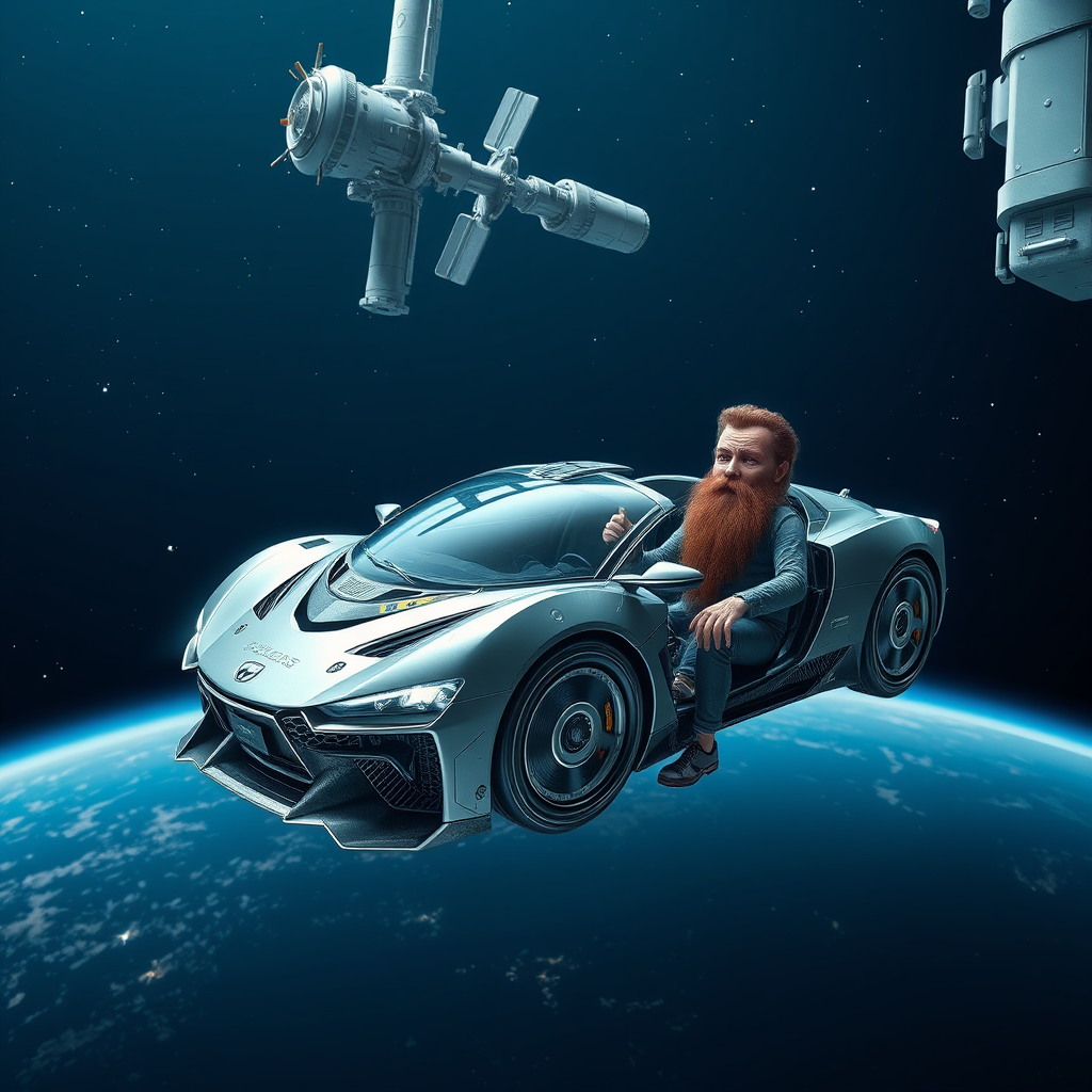 A photorealistic image of a car in a weightless state, featuring an intricate and innovative spaceship design as it nears a space station. The scene is set against a backdrop of deep blue space, with Earth visible in the distance and a sky full of stars. The composition is stunning, rendered in 8k with exceptional attention to detail. Two characters with unique and imaginative features, inspired by concepts like Ironman and motorbike culture, are present. They have striking facial details, including big heads, long beards, and pointed footwear. The image plays with creative anatomies and artistic interpretations, merging fantastical elements like fused fingers and unconventional proportions. Despite its surreal components, the artwork maintains a sense of fluidity, with seamless blending of colors and textures, ultimately creating a remarkable visual experience that challenges traditional notions of form and design.