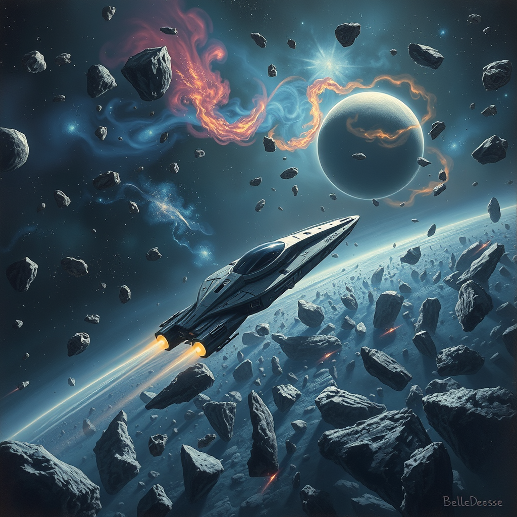 A breathtaking painting of a lone alien spacecraft skillfully navigating through a dense asteroid field, its sleek design reflecting the cold emptiness of space. The scene is alive with an array of meteorites hurtling past, distant stars twinkling like distant beacons, and wisps of colorful gas clouds swirling in the background. All rendered in the ethereal, dreamlike style of BelleDeesse, adding an otherworldly elegance to the cosmic ballet.