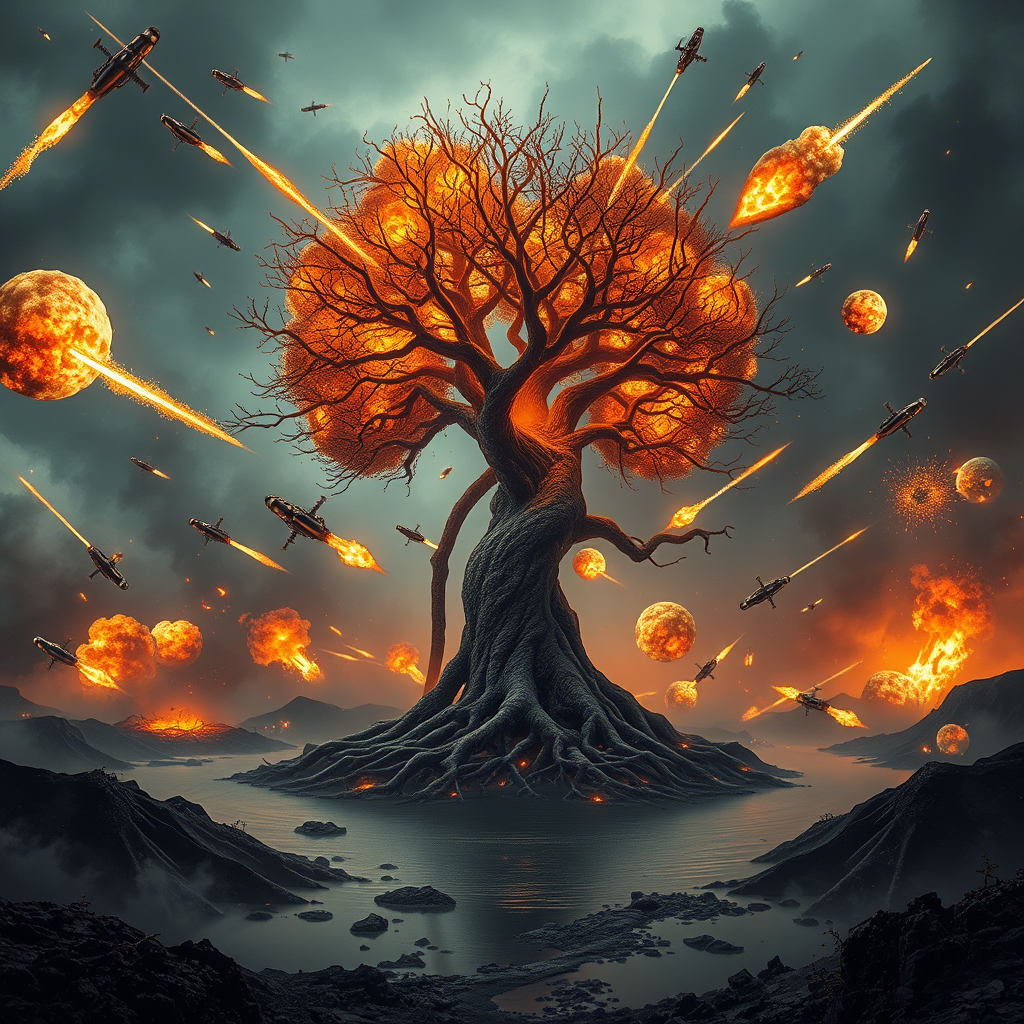 In a surreal, apocalyptic war-torn landscape, a colossal tree shaped like a human kidney stands at the center, its branches mimicking the complex patterns of alveoli, glowing with fiery cracks. This tree, embodying both life and fragility, stands defiant amidst chaos as it endures a ferocious assault. Fiery projectiles pierce the smoke-filled sky, leaving searing trails of embers and ash behind. Some fireballs hang ominously mid-flight, while others have collided with the ground, triggering massive explosions that scatter debris and ignite roaring infernos around the area. Below, the once tranquil lake is now a tempestuous cauldron, its surface disrupted into violent ripples, with portions vaporizing into mist due to the intense heat and carnage. The surrounding terrain bears the scars of battle, with scorched and charred hills looming, smoke spiraling ominously, and a halo of impact craters forming a bleak barricade around the enduring tree. Overhead, the sky is a chaotic tapestry of dark, stormy clouds blended with intense crimson flames and the faint glow of a dying sun barely breaking through the destruction. The blinding flashes from the fireballs and their explosive impacts cast stark shadows and illuminate the battlefield with a dramatic, cinematic vibrancy. This scene captures a desperate, climactic moment of battle, conjuring an atmosphere of epic struggle and annihilation, with the tree serving as a poignant emblem of life's vulnerability amid utter devastation. The depiction is rendered with hyper-realistic precision, displaying dynamic motion, vivid hues, and meticulous details of fire, smoke, and the fractured environment.