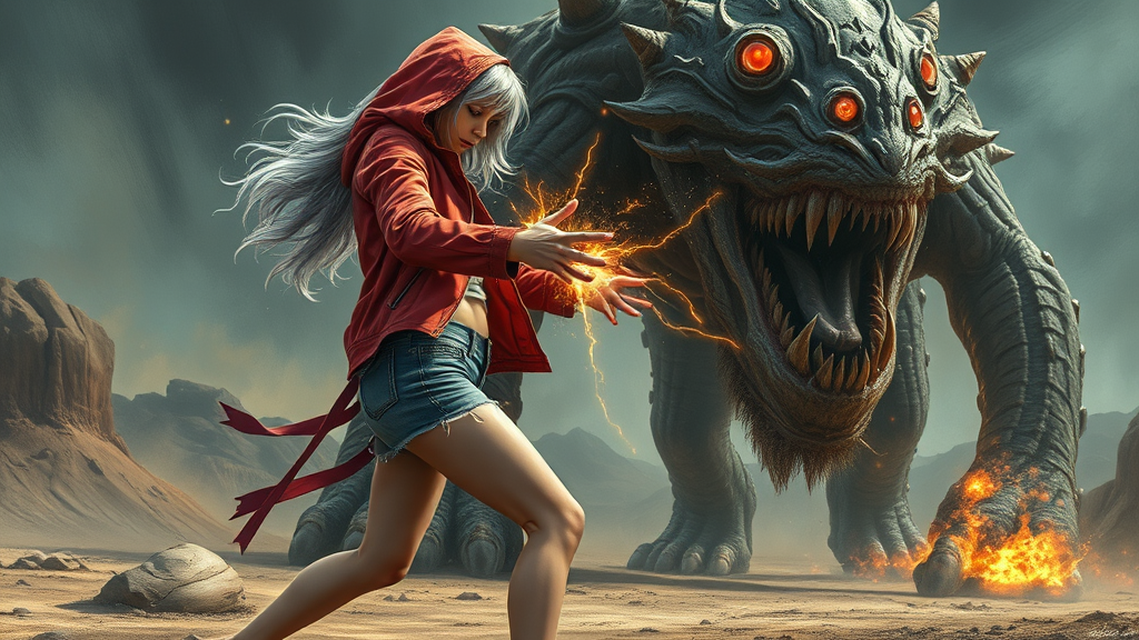 A silver-haired girl with a stylish hooded crimson jacket, short denim shorts, and bare feet fights a colossal creature in a post-apocalyptic landscape, with unusual energy glowing from her hands, depicted in a hyperdetailed painting. Influenced by luminism and octane render, the artwork features complex bar lighting and intricate fractal isometric detail with bioluminescent effects. The scene captures the styles of masters like Martina Fačková, Prywinko Art, Artgerm, WLOP, Alphonse Mucha, and Tony Taka, with a hyperrealistic cover photo quality in vibrant colors. The hand-drawn portrait blends bright and gritty realism, combining elements of Da Vinci and Erté, in 12k resolution with intricate, high-definition, cinematic visuals. The rough sketch integrates a bold fusion of dark and loose lines on paper, capturing the essence of real-life human grace and intensity amidst the chaos.