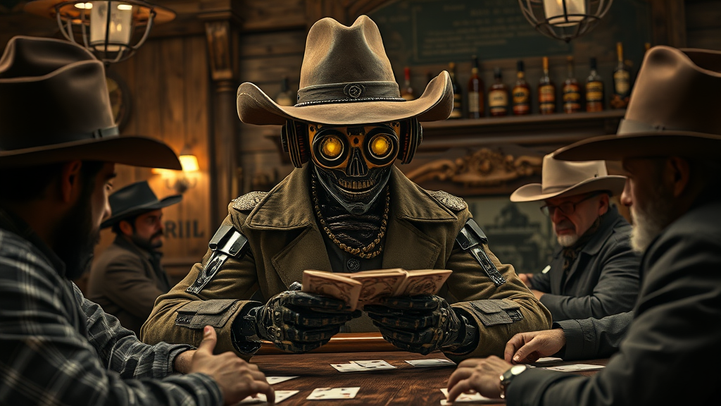 A highly detailed portrait of a steampunk-inspired robot engaged in an intense poker game in a rustic western saloon; the room is rich with old-world charm, wooden textures, and dim lighting. The robot, clad in a worn leather cowboy hat and a duster coat, exudes a mix of futuristic and antique aesthetics. It has glowing mechanical eyes focused intently on the cards it holds. A pair of vintage revolvers is holstered at its side, hinting at its readiness for a showdown. Surrounding the robot are other players, a mix of humans and androids, each wearing traditional cowboy attire, engrossed in the game. The saloon is adorned with period-appropriate decorations, whiskey bottles lining the shelves behind the ornate bar. Shot in RAW with an 8k UHD quality, using a Fujifilm XT3 DSLR camera, the image captures the intricate details and textures, offering an immersive glimpse into this imaginative fusion of past and future in a classic Wild West setting.
