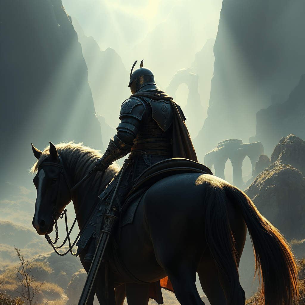 A wandering knight traverses a mystical, medieval landscape in a breathtaking digital art masterpiece. Clad in full, intricately detailed armor, the lone knight cuts a formidable figure, his silhouette defined by cinematic lighting that casts dramatic shadows around him. The scene is infused with a rich medieval ambiance, evoking the allure of ancient tales and uncharted lands. Despite the knight's imposing presence, there's an ethereal quality to the scene with a subtle hint of femininity, as if the spirit of a watchful protector is near. A noble horse stands by, its majestic form a testament to the partnership of rider and steed. The knight's helmet glints in the golden light, while the intricate details of the armor tell stories of battles fought and won. The artwork captures the essence of an RPG fantasy world, celebrating the timeless adventure of the wandering knight without the distractions of duplication, distortion, or imperfections.