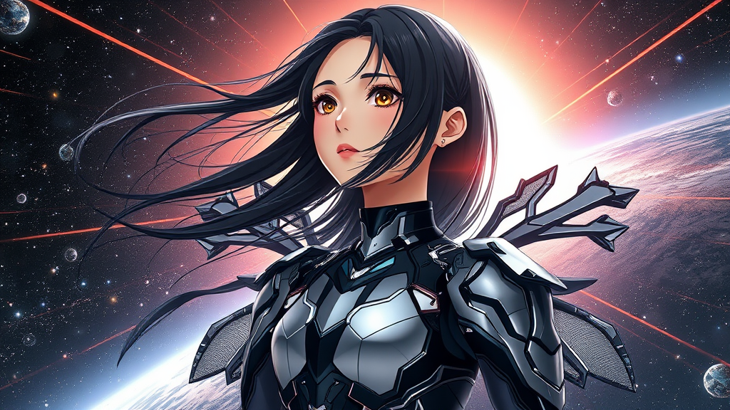 A full portrait close-up of an entrancing girl in a sleek futuristic exo-suit, her mesmerizing gaze directed towards the cosmos. Her flowing black hair frames a face that is both ethereal and beautiful, exuding a sense of wonder. She stands confidently with a slender figure, adorned in a glossy black and silver exo suit reminiscent of intricate insectoid designs. Her attire is complemented by elaborate Sci-fi wings, adding to her otherworldly appearance. The aesthetic is a fusion of the styles of Tsutomu Nihei and Akira. Behind her, a bright quasar shines brightly in an expansive outer space setting, casting dramatic shadows and complex lighting effects. The backdrop is filled with the vast beauty of the galaxy, featuring vivid space starlight and dynamic plasma beams, all rendered in stunning 8k UHD quality, blending the realms of anime art and hyper-realistic graphics.