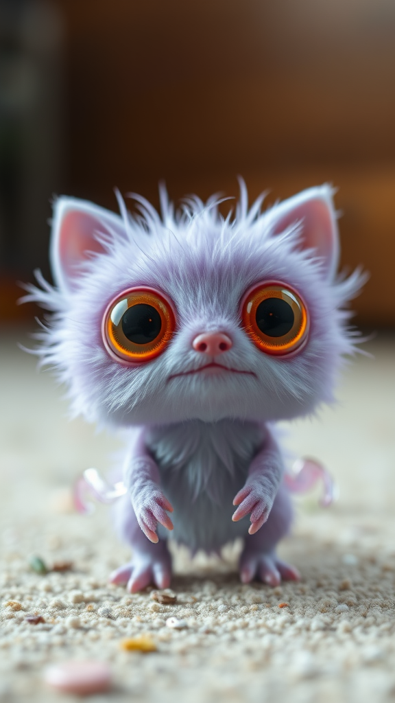 A whimsical, tiny, lavender-hued furry creature with glowing amber eyes, rendered in 3D using Unreal Engine with realistic fur details. Inspired by a fisheye art style, it features endearing, large circular reflective eyes and a Pixar-like cinematic smoothness with intricate details. The creature has two heads and two faces, with the image creatively cropped and slightly out of frame. It showcases quirky, twisted fingers, a long neck, and an abstract, surreal form, embodying a playful but peculiar aesthetic. The scene is marked by low resolution, giving it a grainy, artistic quality, with an array of imaginative mutations such as floating limbs and grossly exaggerated proportions. This unique design is both charming and bizarre, capturing the essence of a cartoonish, animated toy figure within a surreal universe, all while maintaining a sense of wonder and creativity.