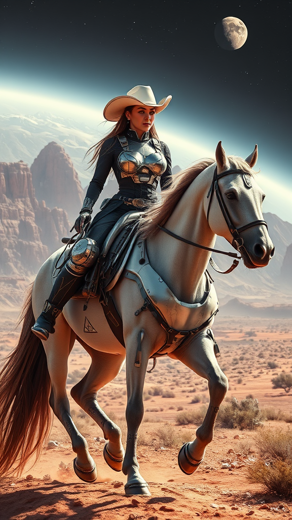 A stunningly beautiful space cowgirl astride a sleek, technologically-advanced horse, set against a dramatic backdrop of a wild west sci-fi landscape blended with futuristic elements; her attire is an exquisite blend of classic cowgirl style and cutting-edge space-age fashion with intricate detailing; the scene is captured in ultra-realistic photography with incredible depth and clarity, embodying a vivid sense of adventure and the vastness of space, rendered in breathtaking 8K resolution, with a focus on the long, expansive 9:16 cinematic aspect ratio, evoking a sense of vibrant energy and daring spirit.