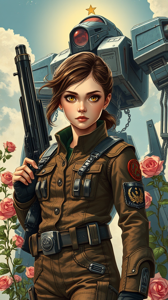 A young girl in a worn futuristic suit stands confidently, her gaze fierce and determined, evoking the bold spirit of a Soviet poster. The backdrop features a juxtaposition of a sleek gun and delicate roses, symbolizing strength and beauty. Towering in the background is a majestic Mech, its metallic form gleaming under the bright sun. The scene is painted in the vivid style of anime and manga graphics, using a palette of dark, rich colors and intricate offset printing. Every detail is meticulously crafted, from the ornate patterns on her suit to the high-detail rendering reminiscent of Johanna Rupprecht and William Morris. This visually striking image is designed to captivate with its intricate details and ornate embellishments, akin to an octane render, a work deserving of trending status on Artstation, perfectly framed within an artistic 9:16 aspect ratio.
