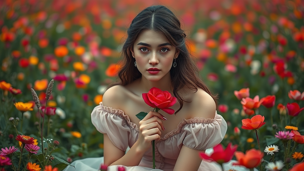 A cinematic portrait of a woman in an elegant dress seated in a field of vibrant flowers, delicately holding a rose. Her face is detailed and symmetric, capturing a realistic and intricate expression. Despite being a highly detailed low-resolution image, it contains digital imperfections such as jpeg artifacts and watermark hints. Her anatomy is slightly off with a few missing or extra fingers, and the composition awkwardly crops parts of her form. There are signs of artistic errors like poorly drawn hands and feet, and occasional extra limbs peeking through, giving it a subtly mutated and blurry appearance. The overall effect is both intriguing and unsettling, blending beauty with subtle disfigurements and a sense of unease.