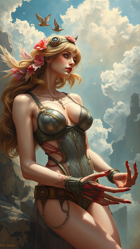 Airy, pin-up, sci-fi, steampunk, intricately detailed, realistic, figurative painting, fine art, oil painting on canvas, stunning artwork inspired by Daniel F Gerhartz with surreal anatomy, soft focus, unusual limbs, unique fingers, artistically abstract hands, imaginative forms, dreamlike elements, creative mutations.