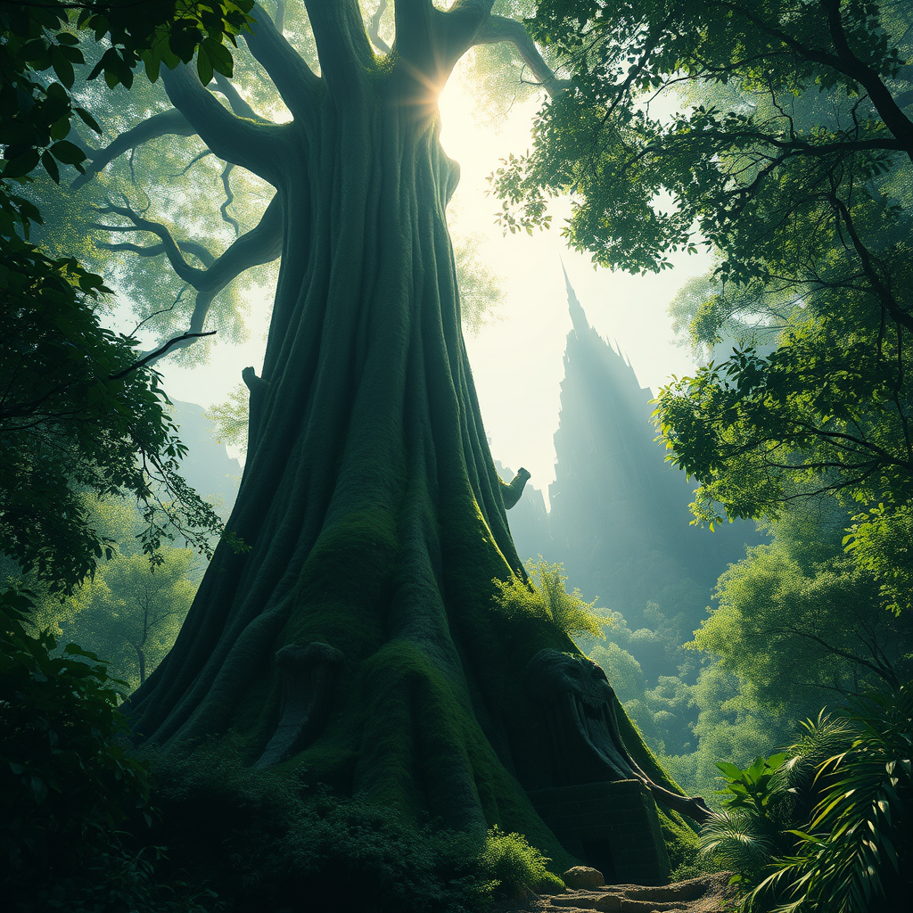 Treebeard standing imposingly at the base of the tower of Orthanc, surrounded by lush, dense foliage, capturing the essence of a fantasy world. The scene is a digital painting with hyper-realistic details, inspired by Alan Lee and John Howe. It features a wide-angle perspective, with sharp focus and stunningly beautiful cinematic lighting that casts god rays through the dense canopy of leaves. The atmosphere is both dystopian and tranquil, with a sci-fi twist. The scene is rendered in 16k UHD HDR, capturing every intricate detail. Treebeard’s moss-covered bark and gnarled branches are emphasized, while elements of surrealism are subtly woven into the landscape, creating an ethereal feel. The overall composition is visually stunning, set against the dark silhouette of Orthanc, with a sense of stillness and ancient wisdom emanating from the scene. The painting captures the essence of a mystical, otherworldly journey without the presence of any distortions or artifacts.
