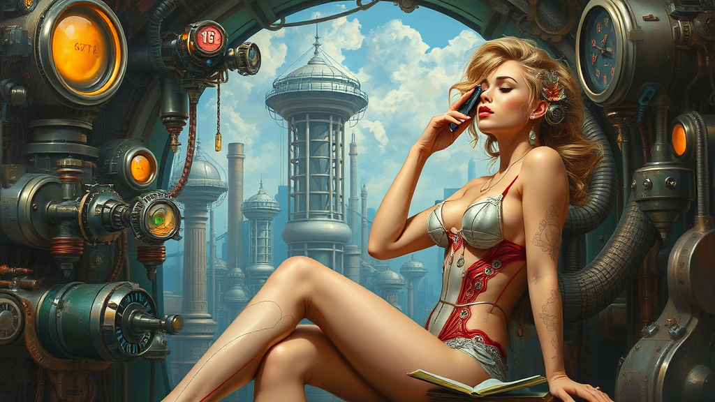 Airy and detailed sci-fi steam punk scene featuring a pin-up style figure, painted in the realistic and figurative style of fine art on canvas. The setting is futuristic yet vintage, with intricate machinery and ethereal elements, capturing a sense of timelessness. The painting reflects the beauty and skill of Daniel F Gerhartz, with a focus on graceful anatomy and vivid details. Elements of surrealism are present, with slightly abstract features adding a touch of whimsy to the composition.