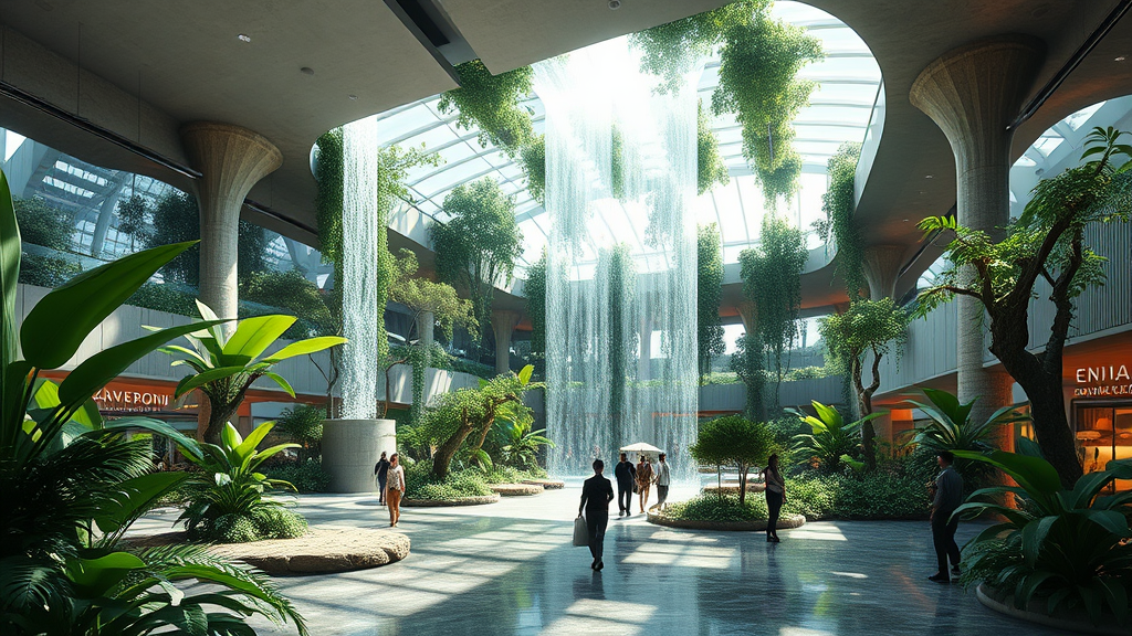 Epitome of biophilic design featuring a public atrium with an indoor waterfall, lush greenery, and verdant plants. Imagined using Unreal Engine and photorealistic CGI, the 3D render includes a flawlessly crafted interior space. Despite a focus on high quality, the depiction should consider abstract elements such as exaggerated forms, unusual textures, and an artistic interplay of light and shadow, evoking a sense of ethereal beauty. The scene is intentionally imperfect, allowing for creative quirks, and texture anomalies which add character and intrigue. Figures in the space are stylized, hinting at a dreamlike aura, enhanced by vibrant colors and surreal architecture that captivates and invites exploration.