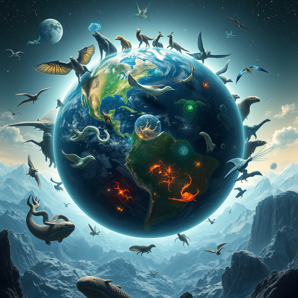 On an alternative version of Earth, the planet is populated by a diverse array of sentient species, each evolved from various animals. The landscape is shaped by ancient ecosystems and features floating mountain ranges and bioluminescent forests. Society is a harmonious blend of technology and nature, where energy is harvested from the environment without depletion, fostering a global community that thrives on cooperation and mutual respect among species.