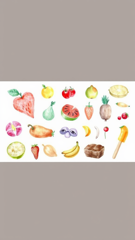 Delicate watercolor food illustrations, bright and vibrant, each item individually placed against a pristine white backdrop, capturing their essence without any shadows, inviting a playful and whimsical culinary exploration.