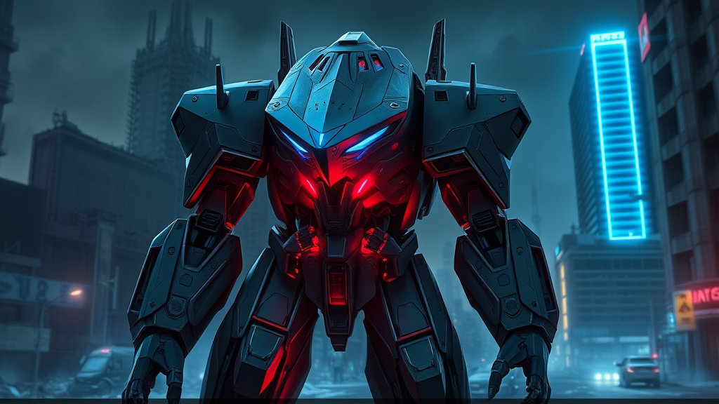 A highly detailed mech with a triangular head and titanium armor, featuring sharp, angular shapes in a cyberpunk setting. Set against a dramatic, dark background with blue energy coursing through its design, the mech stands amidst the ruins of futuristic skyscrapers on a city street. The overall atmosphere is cold and gloomy, capturing the essence of a futuristic, hyper-detailed sci-fi universe. The scene is bathed in muted colors with a blue lux illumination casting bright light from one side, accentuating the mech's sharp angles and casting deep shadows. The background is slightly blurred to emphasize the mech's imposing size, with beams of energy and flashes of light adding to the dynamic composition. The environment is portrayed with elements of anime and manga, emphasizing gigantism and high-rise space. The mech's appearance incorporates small details, contrasting sharp angular features with rounded elements infused with red hues. Despite its complex design, the mech's aesthetics maintain a cohesive futuristic style, free from distortions or disfigured proportions, while capturing the essence of a science fiction narrative.