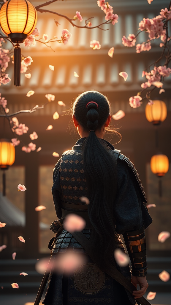 A young samurai with long flowing black hair tied in a ponytail stands poised in a serene Japanese temple. He is clad in intricately detailed samurai armor. Surrounding him, delicate cherry blossom petals drift gently through the air, illuminated softly by traditional paper lanterns that cast a warm glow. The scene is bathed in the ethereal light of a glowing sunrise, creating tranquil and delicate shadows that dance across the temple's surfaces. The atmosphere is enriched by dramatic lighting that highlights the high-detail textures and rich colors of the scene. This ultra-high-resolution, highly detailed photo captures the hyper-realistic lifelike textures using physics-based rendering and cinematic qualities akin to Cinestill 800 film with a shallow depth of field from an f1.6 lens, resulting in a hyperrealistic depiction of this timeless moment.