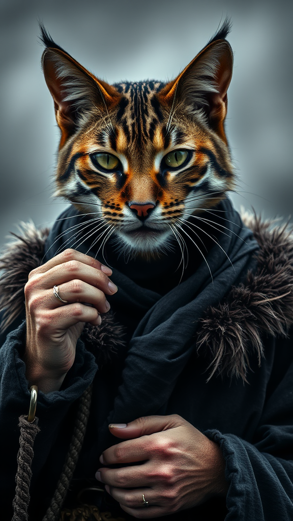 A full-length portrait close-up photograph featuring highly detailed feline facial features, the subject playfully engaging with the camera. The figure has a male humanoid body adorned with obsidian druid robes, complemented by fur trimmings. Captured outdoors with dramatic cinematic lighting, the pose is dynamic and intense, yet life-like realistic aspects are juxtaposed with intentionally awkward execution, creating an intriguing blend. The robes are intricately designed, but some elements reflect a 'bad artist’ touch, with slight issues like disproportionate features, fused fingers, and extra ears. The overall atmosphere is monochrome with cold colors, set against a simple background with subtle noise, balancing the uninspired with the remarkable.