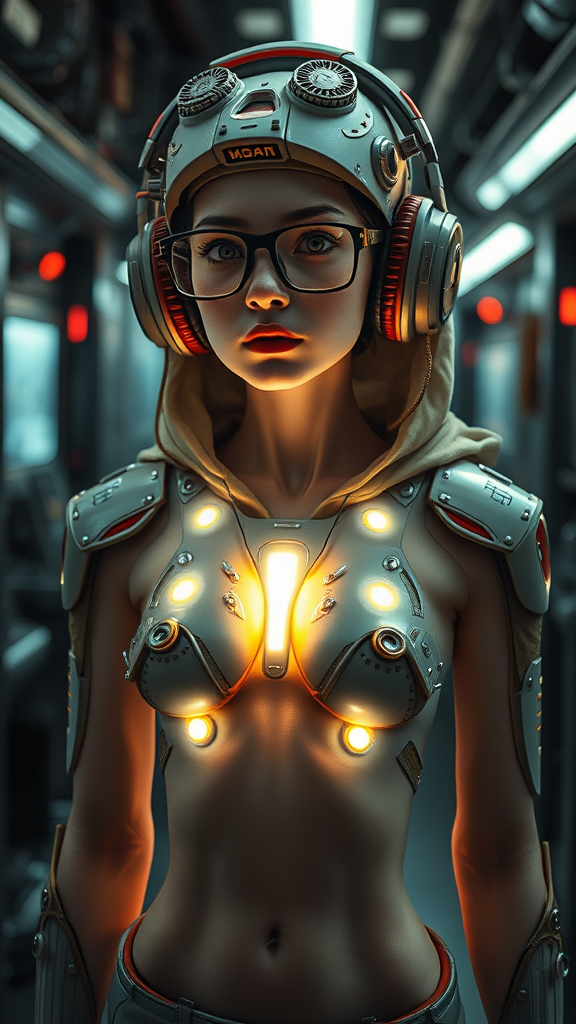 Mechanics, cyborg girl, nuclear art, gloss, depth of field, super detail, cinematic, cyberpunk lighting from multiple sources, cinematic lighting, Mitakon Speedmaster 65mm, ISO 100, glasses, mugs, headdress, flat chest, skinny build, glowing accents on torso, piercing light on the chest, hood, headphones, bare neck, narrow hips, heels, bright light, gold, rivets, folded torso, two faces, unique design, artistic distortion, surreal elements, rough proportions, otherworldly features, cloudy eyes, abstract expression.