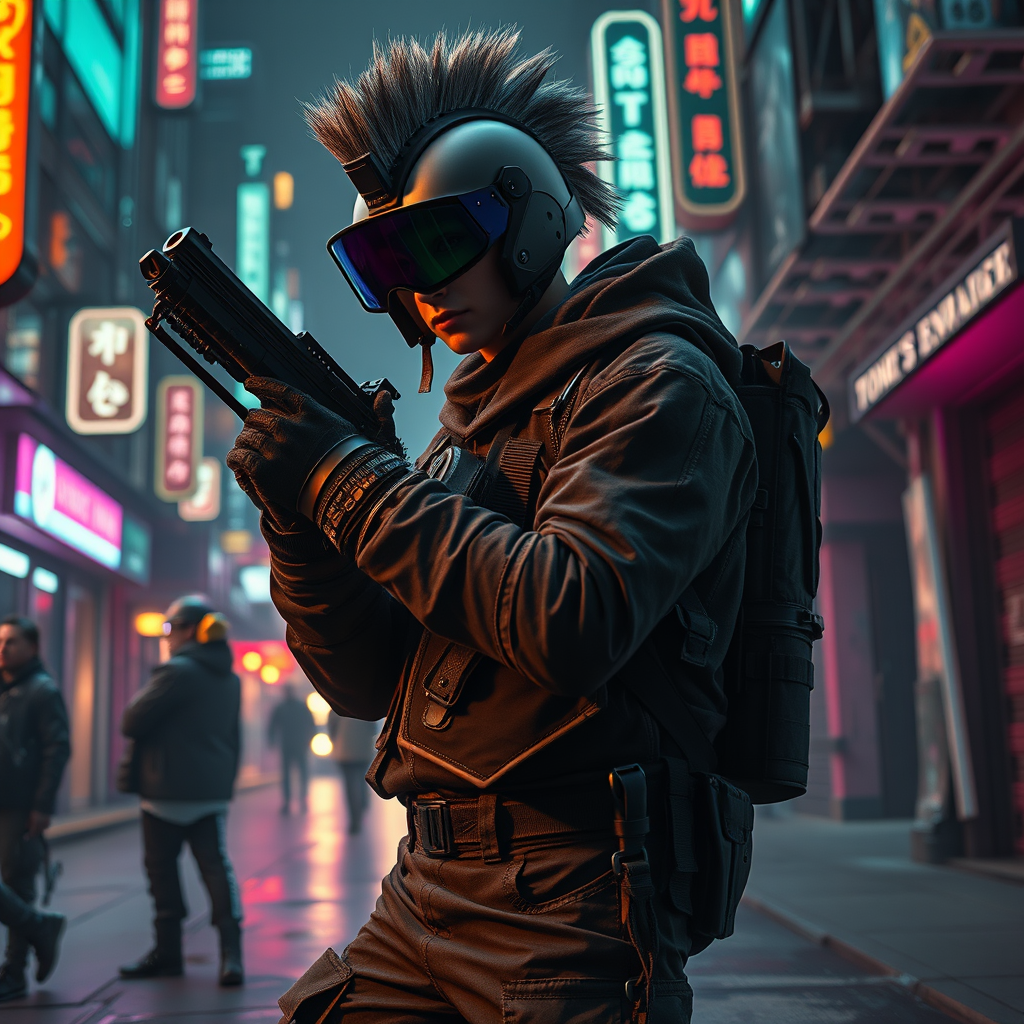 Masterpiece full-body shot, hyper-detailed raw photography featuring a cyberpunk theme, capturing a realistic and highly-detailed 3D rendering. This ultra-high-resolution art piece delivers a cowboy aesthetic in a photorealistic depiction, blending into a complex and surreal cyber setting. The scene is atmospheric and sinister, featuring a dynamic angle with advanced cyber helmets and mecha armor, complete with mechanical arms and an exo-suit. A cowboy with no human features dons worn asymmetric attire, including a tactical oversized black hoodie, and an advanced black helmet with a HUD display. The character wears black tactical gloves, black techwear cargo pants, and futuristic clothing, embodying a mohawk punk rebel look. The cinematic, sci-fi scene takes place in a synthwave-inspired night environment, with intricate and futuristic design elements. The focus is sharp and precise, showcasing an aggressive pose with high-tech weaponry. Neon street lights of the cyberpunk city cast vibrant colors against the scene, accompanied by dramatic lights and shadows. This Insta-worthy image captures the Photo of the Year essence, rendered with Octane for supreme photorealism, surpassing expectations in detail and creativity.
