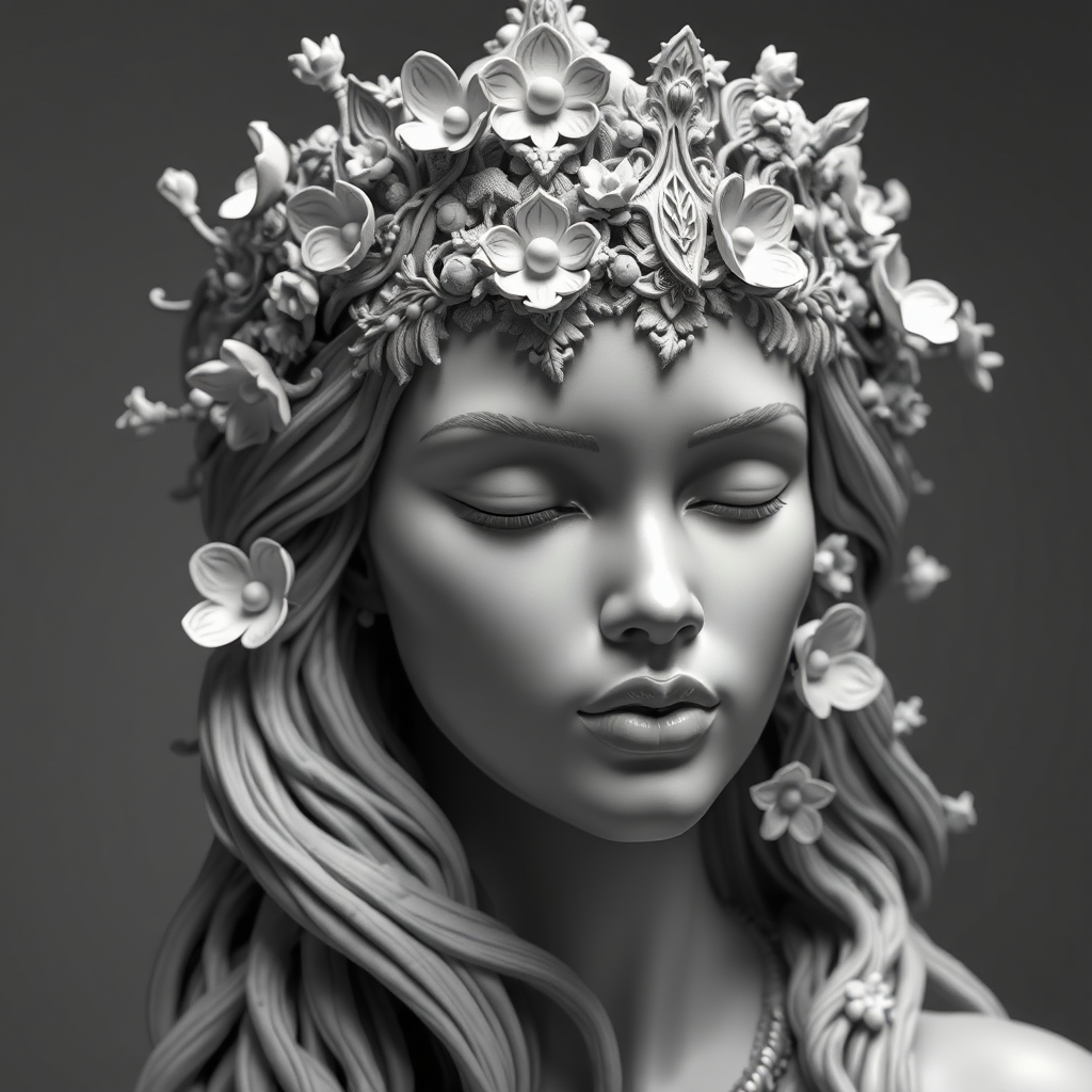 A hyper-realistic sci-fi sculpture of an Indian woman crafted in black and white, featuring an intricate crown that blends futuristic elements with traditional motifs. Her eyes are gently closed, conveying serenity and depth. The sculpture's surface is adorned with detailed depictions of nature, like delicate vines and ethereal flowers, woven seamlessly into her flowing hair and crown, adding an organic touch to the otherwise sleek design. The overall composition exudes a harmonious blend of cultural richness and speculative technology, with textures and intricate details that capture both a sense of history and an imaginative future.