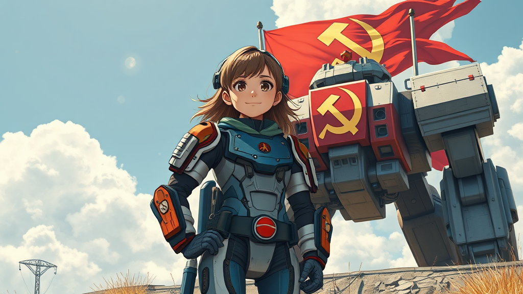 A young girl in a futuristic sci-fi suit stands confidently, reminiscent of a classic Soviet poster. The iconic hammer and sickle symbol prominently graces the background, alongside a towering mech. The setting is bright with sunny weather, capturing the essence of anime and manga graphics enriched with deep, dark colors. The composition displays high detail with the charm of offset printing, reflecting a sense of joy and optimism. The poster emerges with an 8K, HD quality and CMYK richness, effectively blending natural lighting with the stylistic elements of propaganda art from the USSR era.