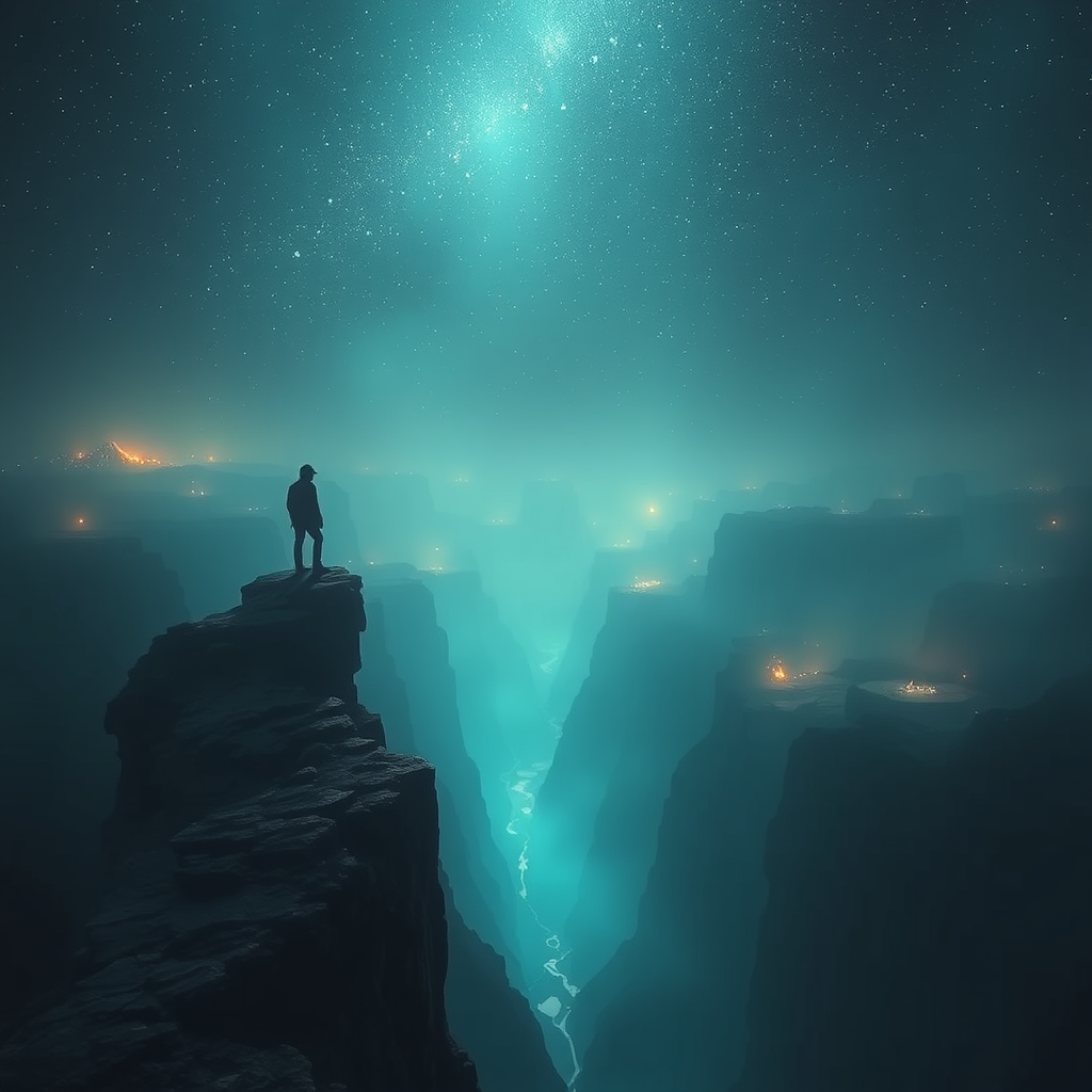 Ethereal abyssal landscape illuminated by a faint, otherworldly glow, where an enigmatic figure stands on the precipice, their gaze piercing into the unfathomable depths below. The atmosphere is thick with mystery, swirling with wisps of luminescent mist, as shadows dance across the rugged terrain. A celestial sky looms above, scattered with distant, shimmering stars that cast a spectral luminescence across the scene. The figure's presence feels both fragile and powerful, as if they hold a secret connection to the infinite unknown.