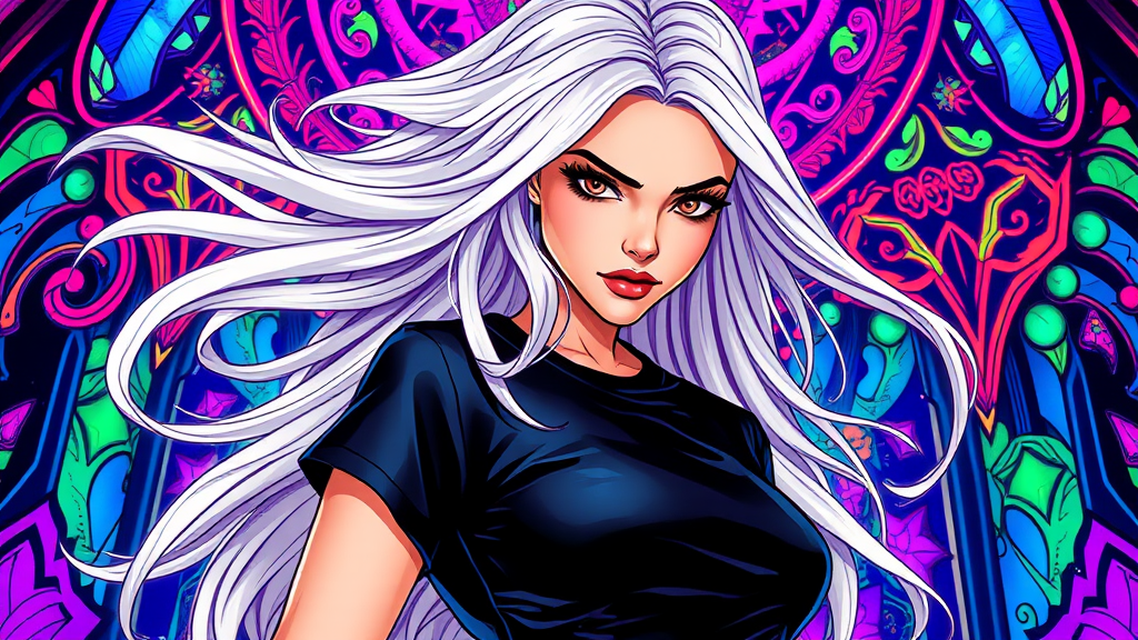 An illustration of a woman with flowing white hair wearing a sleek black t-shirt, depicted in a vibrant fusion of colorful fantasy and cyberpunk manga aesthetics, drawing inspiration from the intricate details of Hans Zatzka's work and the bold outlines of Marvel comics. The image incorporates the smooth, glossy finish found in Yanjun Cheng's style and the vibrant, eye-catching palette of a colorful muralist, creating a stained-glass effect that captures light and shadow beautifully. The scene exudes an otherworldly ambiance, with neon hues and intricate patterns adorning the background, adding depth and dynamism to the composition. Her expression is fierce and enigmatic, embodying the strength and allure of a powerful protagonist.