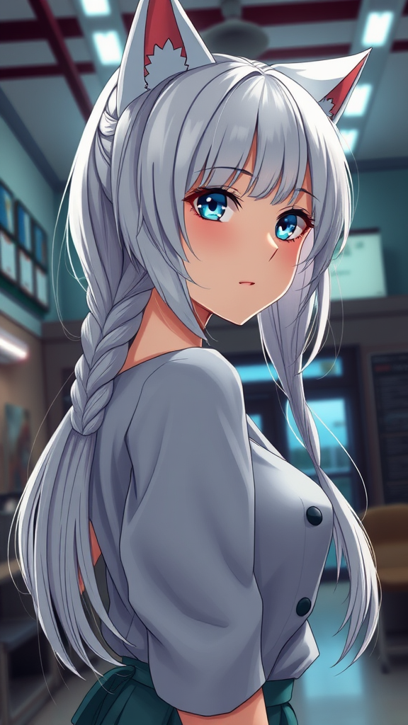 Solo anime girl full body young adult medium chest hyperdetailed school background detailed white hair braid cat ears beautiful detailed blue eyes side view waist-up thick lineart anxious natural light reflection volumetric lighting maximalist photo illustration high resolution intricately detailed complex key visual precise lineart vibrant panoramic cinematic masterfully crafted stunning ultra detailed expressive hypermaximalist colorful rich deep color vintage glamour anime art fantasy art brush strokes anime style photo manga style digital art glow effects hand drawn render dark atmospheric cinematic sensual sharp focus hyperrealistic deep depth of field masterpiece vivid colors modelshoot style professional majestic oil painting inspired by Ed Blinkey Atey Ghailan Studio Ghibli Jeremy Mann Greg Manchess Antonio Moro trending intricate high detail dramatic photorealistic by midjourney and Greg Rutkowski.