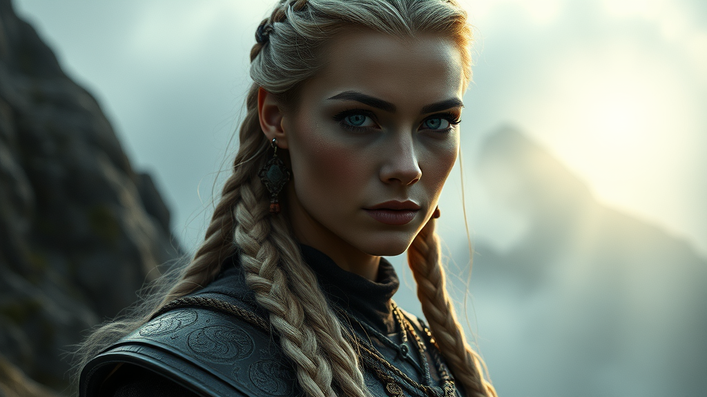 A full-body image capturing the essence of a 25-year-old war princess, a beautiful woman with long braided blonde hair and captivating bright grey eyes. Her face is adorned with cultural paint, and she wears exquisite cloth armor, embodying urban fantasy. This scene, reminiscent of a cinematic film still from an 1980s movie, showcases the elegance and intricacy of Kodak Portra 800 film. She stands poised next to a mist-covered mountain, her symmetrical face and detailed features highlighted by radiant light rays piercing through the fog. The ambiance is one of mystery and enchantment, enhanced by magical lighting beams and dust particles, conveying a mood that is both enlightening and moody. The background exhibits a high level of symmetry and detail, creating a harmonious composition with the princess. The serene atmosphere is brought to life through realistic shadows, ambient occlusion, and tone mapping, resembling the quality of an octane render or a creation in Unreal Engine 5. Her alluring expression and striking gaze, combined with an ultrarealistic portrayal of her skin and armor, make this scene reminiscent of high-end, detailed concept art, fit for a magazine spread under backlit conditions with heavenly light effects.