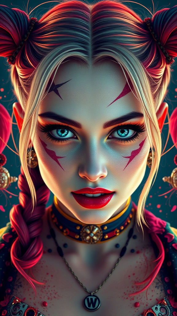 Portrait of Ana de Armas as a vibrant and enigmatic Harley Quinn, intricately abstract and detailed, reminiscent of Tooth Wu, WLOP, Beeple, and Dan Mumford's styles. Rendered with the cinematic and hyper-realistic quality of octane render, this artwork captures a coherent, symmetrical composition with vibrant colors and dynamic elements. Infused with subtle hints of fantasy, the high-detail 8k image features an expressive depth and vivid articulation, suitable for trending displays on ArtStation, evoking the essence of Greg Rutkowski's techniques with an otherworldly allure.