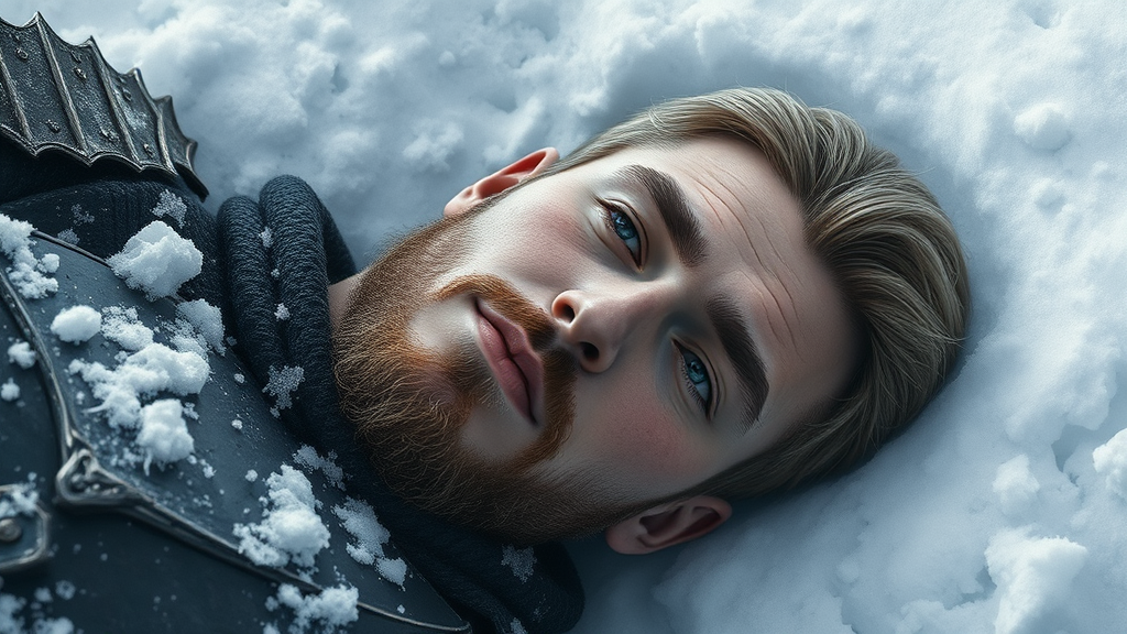 A full male body reclining gently in the snow, representing a male human inspired by Sturm from Dragonlance, embodying the essence of an honorable human knight, pausing for rest in a serene snowy landscape. The scene captures a detailed face and expressive eyes, rendered in a masterpiece quality with the highest resolution, striking 8k photorealistic detail. Artistic influences by Jeremy Mann, Sandra Chevrier, and Maciej Kuciara bring sharpness and realism to the image, enhanced with authentic shadows and a subtle 3D effect. Negative elements like low resolution, anatomical inaccuracies, inappropriate content, and non-serious styles are avoided to preserve the integrity and grandeur of the heroic depiction.