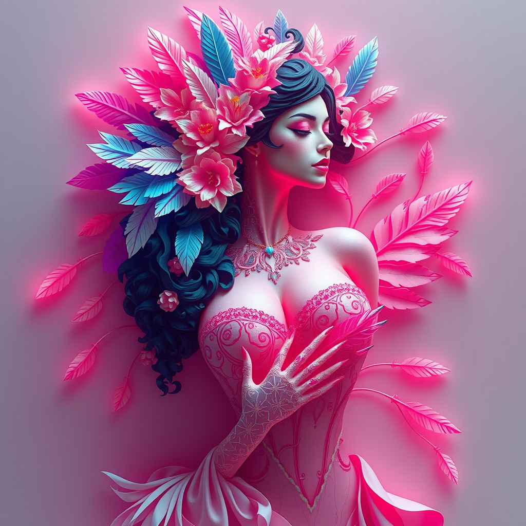 A digital painting inspired by paper craft style of a voluptuous concubine adorned with feathers and flowers reminiscent of Ernst Haeckel and Maria Sibylla Merian. Influenced by the artistic touch of Tristan Eaton, Victo Ngai, Artgerm, Rhads, Ross Draws, Kaethe Butcher, Hajime Sorayama, Greg Tocchini, and Virgil Finlay. The piece embodies a sci-fi essence with vibrant colors and neon lights in an 8k, UHD, HDR resolution. Created by Ilya Kuvshinov on Pixiv, it showcases a fusion of elegance and surrealism. The figure is portrayed with an elongated neck, delicate features, and intricate hands, enhancing the ethereal beauty without distorting the overall harmony. The composition remains clear and focused, avoiding any distractions or low-quality elements.
