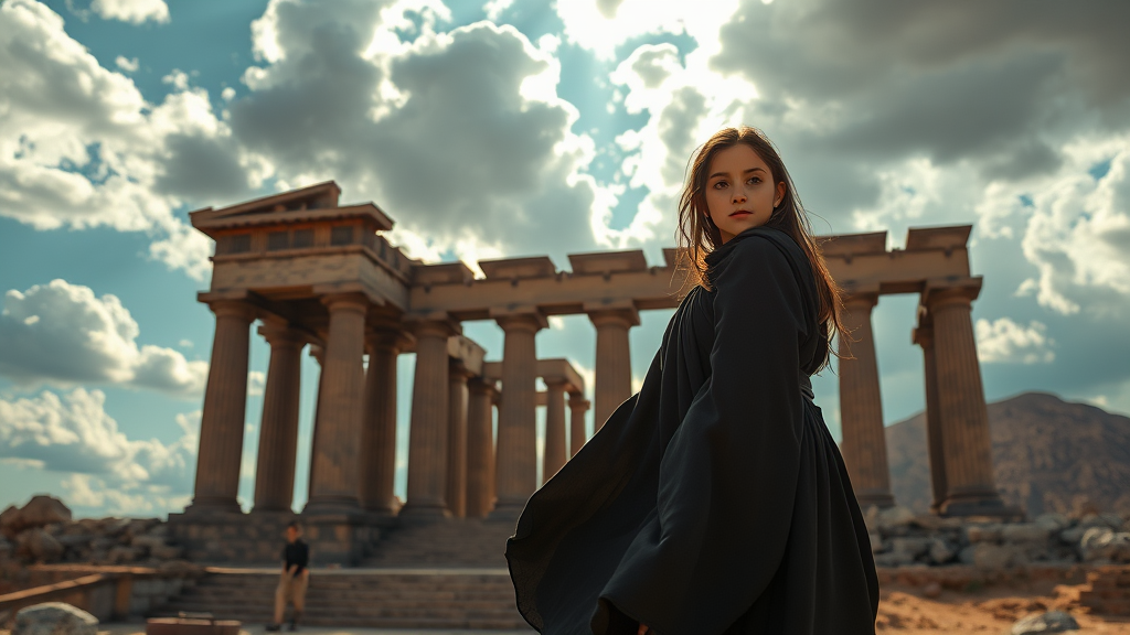 A lone girl dressed in dark, flowing robes stands against the backdrop of an ancient temple, her symmetrical eyes gleaming under a sky scattered with dramatic lighting. Captured in sharp focus and rendered in stunning hyperrealism, the image showcases a dynamic pose that brings life to the scene. The intricate details resemble those of high-definition photography, yet with a touch of artistic creativity, blending elements of CGI and digital art. Utilizing advanced techniques such as raytracing and physics-based rendering, the result is a highly complex and realistic depiction.