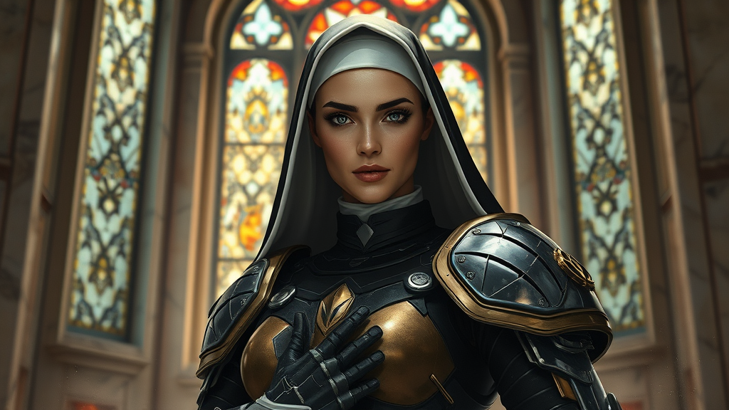 Create a majestic full-body portrait of a devout Sister of Battle in an action-packed scene, showcasing a beautiful woman adorned in sci-fi nun armor, poised in front of a grand stained glass window. Her symmetrical face is detailed, with reflective eyes, dark eyebrows, and subtle makeup, accentuating her fierce determination. The setting features marble walls with dust particles visible in the air, illuminated by a dramatic interplay of detailed, rim, and chiaroscuro lighting from above. Capture the essence of a professional, impressionistic oil painting, reminiscent of the styles of Waterhouse, John Constable, and modern artists like Ed Blinkey, Atey Ghailan, and Studio Ghibli. The composition should be trending on ArtStation and CGSociety, reflecting intricate, high-detail artistry, with influences from Makoto Shinkai's Kyoto and other esteemed creators. The scene remains within the frame, emphasizing flawless proportions and masterful anatomical accuracy, harmonizing all elements into a cohesive, visually stunning artwork.