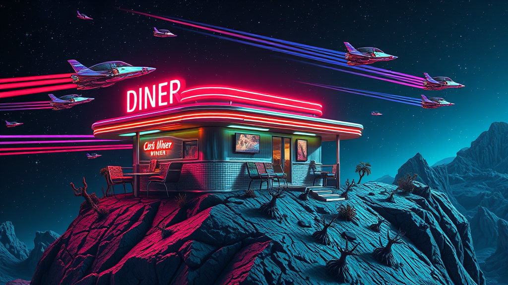 A vibrant retro sci-fi scene set in the 2050s featuring a classic 1950s-style diner perched on a rugged asteroid. The diner, glowing with neon lights, serves as a lively hub amidst the vast expanse of space. Flying cars with sleek, futuristic designs zip around, leaving trails of colorful luminescence that dance against the starry backdrop. The asteroid’s surface, dotted with strange alien vegetation, adds an exotic twist. Dynamic, multi-colored lights play across the diner’s chrome façade, highlighting its intricate retro-futuristic details. The entire scene is a kaleidoscope of colors, capturing the imagination with its nostalgic yet futuristic charm, painted in exquisite 4k clarity.