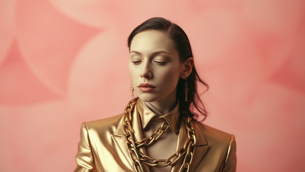 A figure clad in a metallic suit with a twisted chain, rendered in gum bichromate style, blending the whimsical touch of Camilla d'Errico. The scene is bathed in soft light bronze and pink hues, with disfigured, abstract forms reminiscent of webcam photography. A sense of spiritual reverence permeates the scene, akin to religious iconography, infused with the boldness of Donna Huanca's work. The composition melds these elements into a unique portrait, emphasizing raw, unfiltered expression.