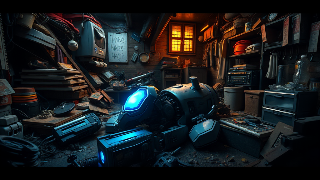 A stunning masterpiece capturing the essence of the League of Legends universe in ultra-high resolution. A wide-angle environmental shot set in a chaotic and cluttered shack, it features an intense action scene. A robot, shattered to pieces, lies with a glowing blue visor, reimagined as a gritty sci-fi cyberpunk gangster. The medium shot is rendered in photorealistic detail with cozy indoor lighting, reminiscent of James Gurney and Katsuhiro Otomo's intricate styles. This cinematic scene is further enhanced by dramatic, dark tones, vibrant nature elements, and volumetric lighting, celebrating the artistry of Craig Mullins and Greg Rutkowski. Octane rendering and studio photo precision bring each intricate detail to life, echoing the dynamic spirit of Cyber 2077, and ensuring it trends on ArtStation.