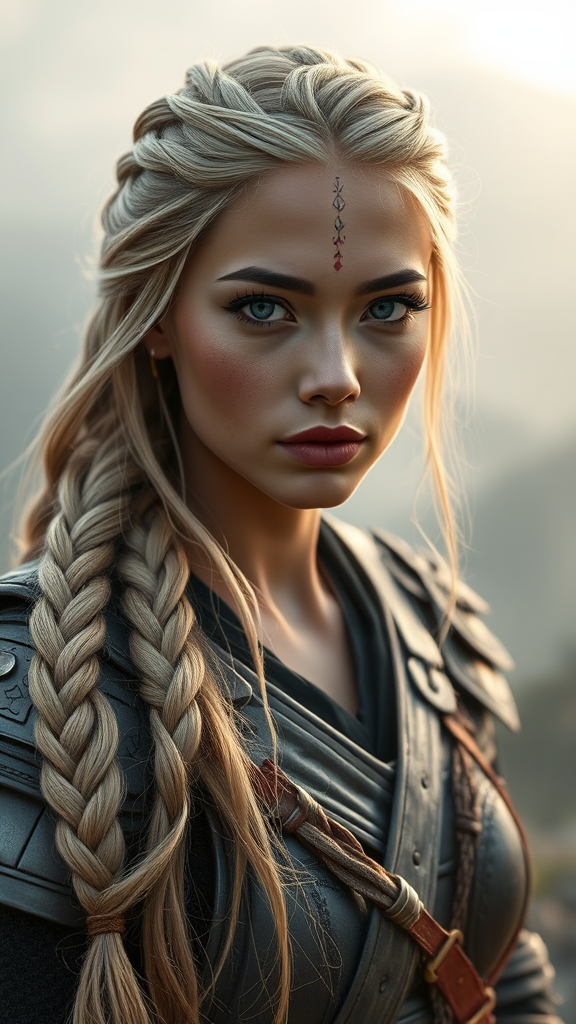 A stunning 25-year-old war princess with flowing blonde hair, intricately braided, stands gracefully against a backdrop of a foggy mountain view. Her captivating, bright grey eyes glisten with a mesmerizing allure, enhanced by her symmetrical face and detailed facial features. She wears elegant cloth armor with cultural face paint, embodying an urban fantasy aesthetic with cinematic flair reminiscent of a 1980s movie captured in rich, analog style reminiscent of Kodak Portra 800 film. The scene exudes a magic realism, with radiant light rays piercing through the mist, creating a dreamlike atmosphere with magical lighting beams and ambient occlusion. The high resolution and detailed artistry capture the captivating realism of her appearance, emphasizing her natural skin texture and the intricate details of her attire. Set in an enchanting landscape, this composition blends the old-world charm of a 1950s camera aesthetic with the modern realism of 3D rendering techniques, producing a beautifully balanced and vividly detailed image.