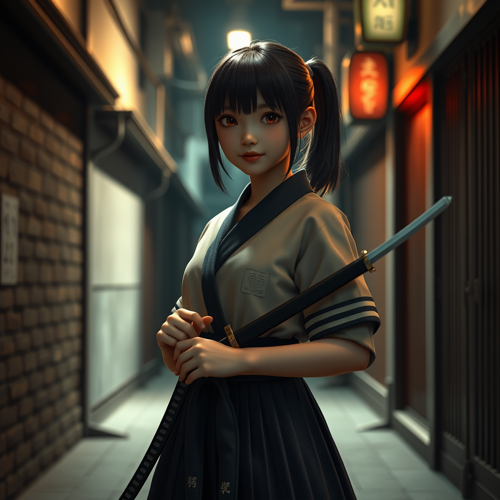 A young Japanese junior high school girl, donned in a traditional school uniform, stands confidently in a dimly lit alleyway, clutching a glistening katana. The cinematic scene is rendered in a highly detailed, photorealistic 3D style, capturing the atmospheric tension of the moment. The backdrop casts moody shadows, evoking a sense of mystery and drama, with the use of an advanced rendering engine to achieve an ultra-high resolution of 32k, while embracing an expressive visual style, maintaining an aspect ratio of 9:16.