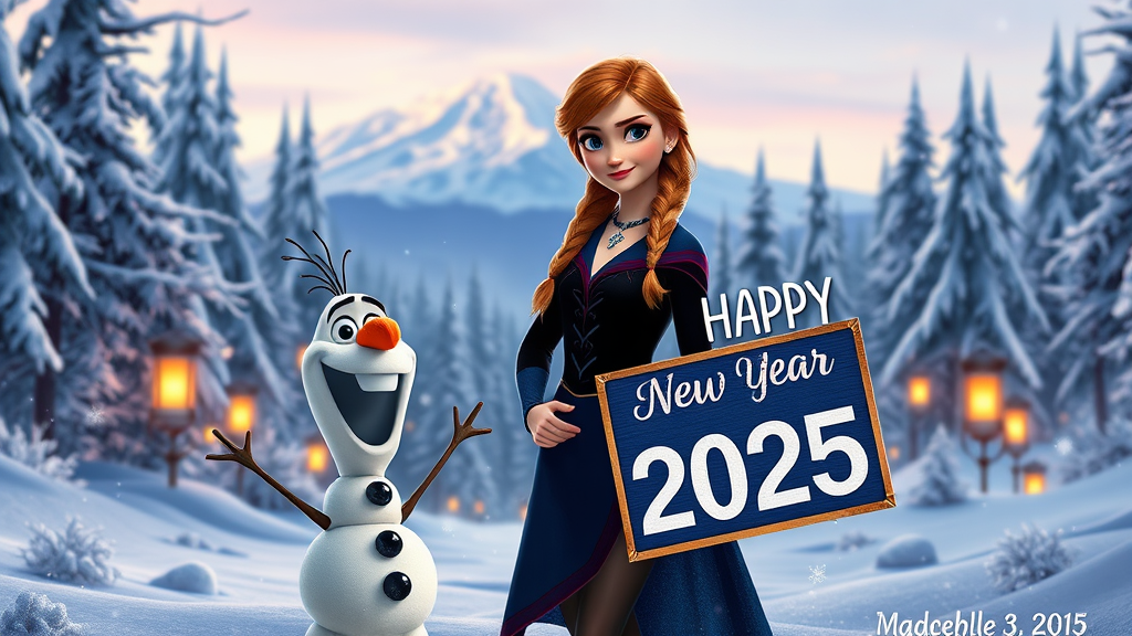 Princess Anna stands confidently amidst the enchanting snowy landscape of Arendelle, her spirited and adventurous personality shining through her bold and daring pose. Her outfit, a sophisticated and slightly daring version of her iconic ensemble, features high shine and modern accents that emphasize her confidence and charm. Her signature pigtails cascade down with playful elegance, hinting at her inimitable style. Beside her, Olaf beams with his usual cheer, holding a sign that reads "Happy New Year 2025" in bright, joyful lettering. Around them, a softly lit winter forest glows, shimmering snowflakes gently falling, illuminated by the warm glow of lanterns that scatter their light across the snow. In the distant background, the majestic North Mountain rises, a subtle nod to their storied adventures. The scene is a beautiful blend of realism and magical winter wonder, capturing the essence of Anna's vibrant spirit and the enchanting world of Frozen.