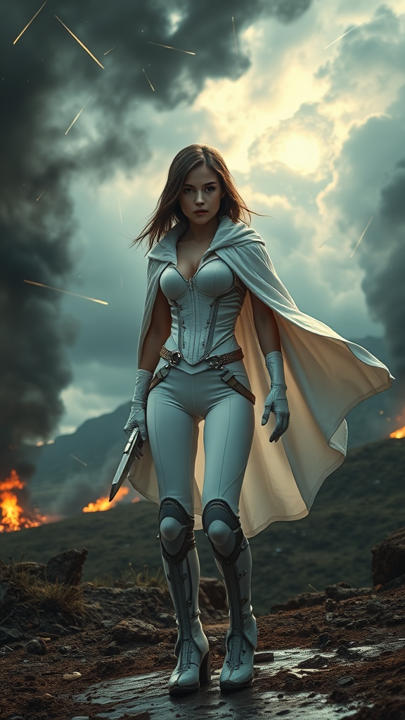 A stunningly beautiful young girl with a slender athletic figure is depicted in an intricate portrait from a slightly lower angle. Her appearance exudes both arrogance and innocence, with a touch of sci-fi flair inspired by Ghost In The Shell. She is dressed in a tight white jumpsuit featuring armored leggings and a dense cloak that flutters amidst a dramatic backdrop. The scene is alive with meteor showers, black smoke from distant fires, and looming thunderclouds. Reflections of the fires flicker in the landscape, enhancing the gloomy and intense atmosphere. The camera captures this moment with super detailed hyperphotorealism, utilizing a Canon EOS 5D Mark IV DSLR with an f/8 aperture, 1/250 second shutter speed, and ISO 100. Subtle textures and stained cinematic lighting play across the scene, highlighting elements like a corset adorned with rivets, and the symmetry of her bare arms, neck, and chest. The ambiance is heightened by natural reflections and bright, almost blinding, light, adding to the ethereal quality of the portrait.