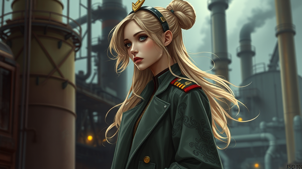 ISO 100, an open imperial raincoat with intricate detailing, flowing blonde hair, embodying a dieselpunk style, aristocratic presence, mesmerizing face, with a diesel plant in the backdrop, retro-futuristic elements, social art influence, maximum intricacy, vintage flair, crafted with realism, digital painting in dark hues, rich complexities, a precisely detailed illustration, captured from a side perspective, illuminated by multiple light sources: a slender figure dressed in imperial officer style, raincoat open to reveal detailed decorations, photorealistic loose blonde hair, captivating facial features styled with Korean-inspired makeup, a dieselpunk aesthetic, with the industrial setting of a diesel plant in the background, embracing retro-futuristic and social art aesthetics, emphasizing maximum detail, vintage and hyper-realistic qualities, conveyed through digital painting in dark tones, intricate details, a side profile view, illuminated from various angles: accessorized with a headdress, hands casually tucked into pockets, featuring a piercing and headphones, hairstyle collected in a bun. Avoids elements like deformities, multiple heads or limbs, unattractive or poorly drawn features, ensuring high quality and proper anatomy.