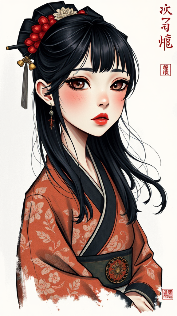 A dark-haired girl dressed in traditional Asian attire, blending subtle ink applications and intricate designs, embodying the work of an appropriation artist. Her expression and pose resonate with gothcore aesthetics, crafted with the detailed texture of a ZBrush sculpture. The piece is a character caricature, offering a portrait that holds hidden, mysterious meanings. Illustrated with painterly strokes, the artwork combines whimsical elements and deep symbolism. --ar 6:7 --s 750 --niji 5.