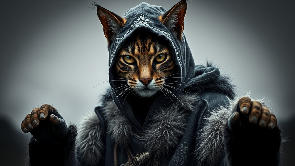 A full-length portrait photograph capturing a highly detailed feline face with intense eyes flirting playfully with the camera; the subject features a male humanoid body draped in obsidian druid robes embellished with fur trimmings. Positioned outdoors in dramatic cinematic lighting, the figure strikes a dynamic pose. The robes boast intricate, realistic textures despite being "badly drawn" with poorly defined outlines. Against a simple, monochrome background with subtle background noise, the composition reveals intentionally flawed elements such as awkward proportions, fused fingers, an extra pair of ears peeking through a hooded cap, and is immersed in cold color tones, evoking an uninspired, yet intriguingly unique, and lifelike character.