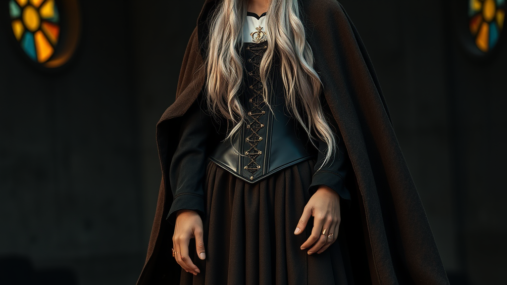 Full body three-quarter close-up, dark fantasy movie style, fiery white long hair, tights with a maxi long skirt, superbly detailed tattered dark brown wool cloak with a rough weave, dramatic background, gloomy and frightening atmosphere, natural blued steel texture, expressive background, super detailed, hyper-photorealism, natural light during golden hour, natural reflections, natural textures, stained glass lighting adding color, cinematic bright lighting, gold accents, corset with rivets, nun-inspired attire, anime influences with striking anime eyes and perfect symmetry, exposed arms, neck, and hands, avoiding unnatural or disfigured features, maintaining anatomical correctness and aesthetic beauty, preserving high quality and resolution, pristine details without artifacts, natural light through round windows creating soft illumination, enhancing the mysterious and ethereal essence of the scene.