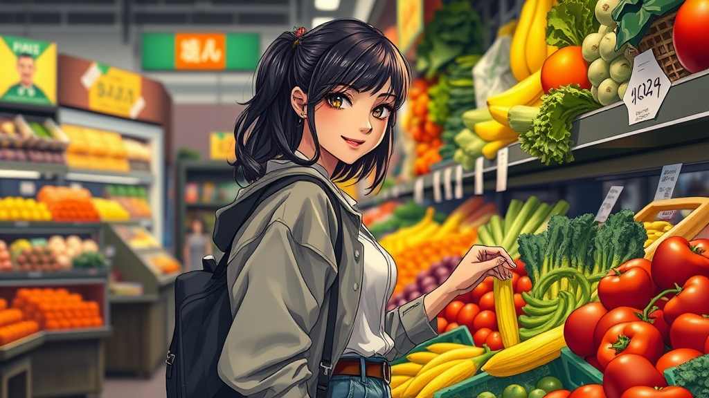 A young woman with an urban chic style stands poised in front of a vibrant produce section, her hand thoughtfully selecting fresh vegetables. She has striking, expressive eyes and a playful smirk, encapsulated in an atmosphere that merges everyday life with a touch of fantasy. The scene is brought to life with vivid, lush colors and intricate details, capturing the hustle and bustle of the supermarket. Her outfit is trendy yet practical, with a stylish jacket and casual jeans, blending seamlessly with the anime aesthetic. The artwork evokes a sense of vitality and modern elegance, inspired by the detailed and dynamic styles of artists like Guweiz and Bowater, bringing an anime-inspired flair to the urban shopping experience.