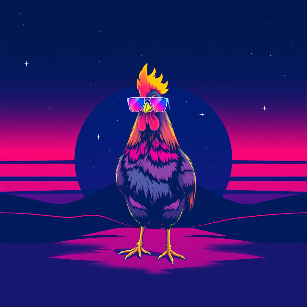 A vibrant 80s-inspired t-shirt design featuring a synthwave chicken sporting an oversized pair of retro sunglasses, its feathers gleaming with neon hues. The chicken stands confidently against a backdrop of a minimalist, gradient sunset in shades of pink, orange, and purple, casting a soft glow. The scene is framed by subtle, swirling contour lines adding depth, set against a deep, star-speckled indigo sky that evokes a sense of nighttime adventure and nostalgia.